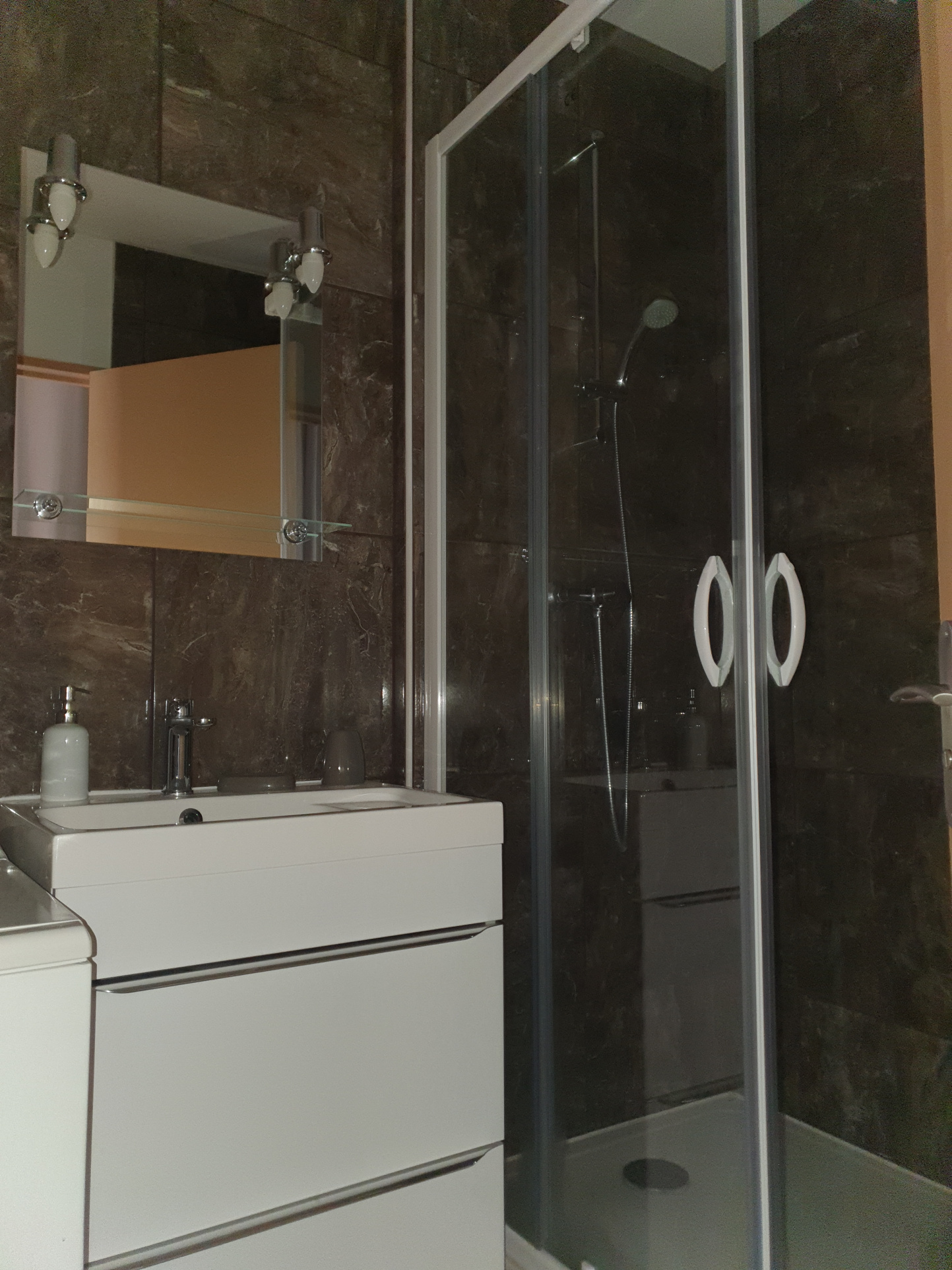 Il se compose d’une cuisine équipée et aménagée ouverte sur une belle pièce de vie avec grand balcon, d’une salle de douche avec WC et d’une entrée avec placard.
