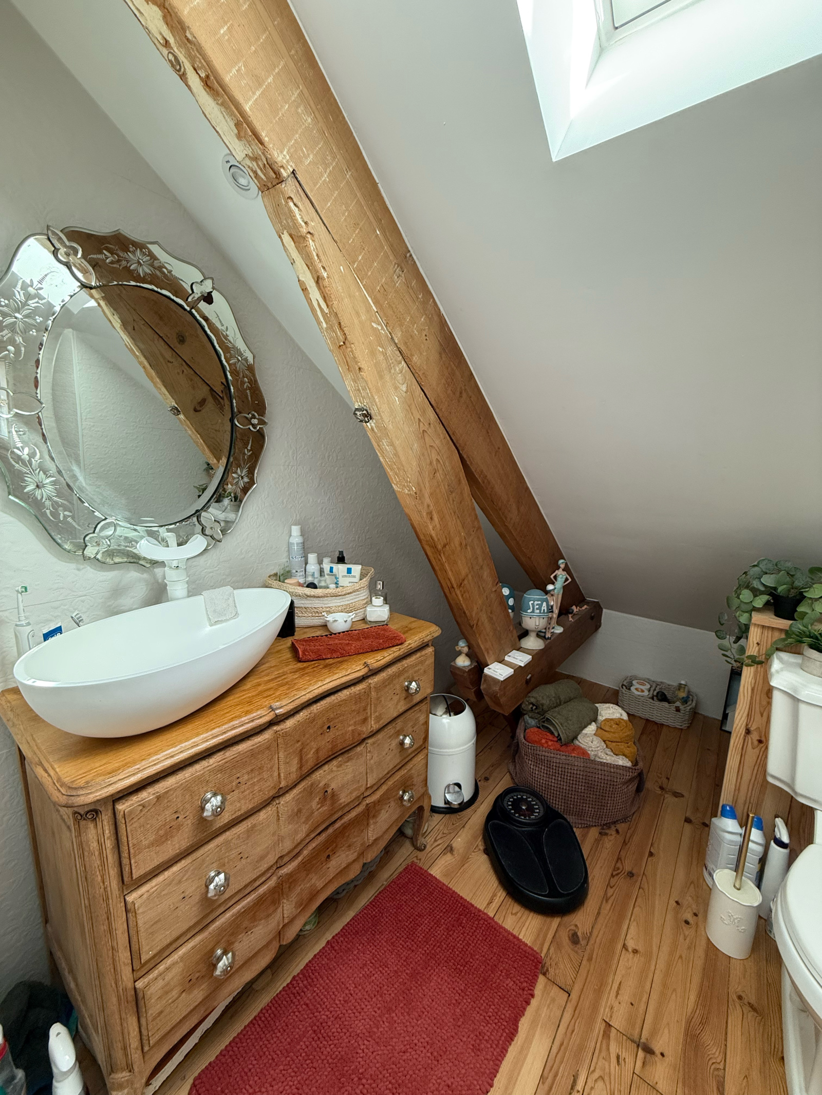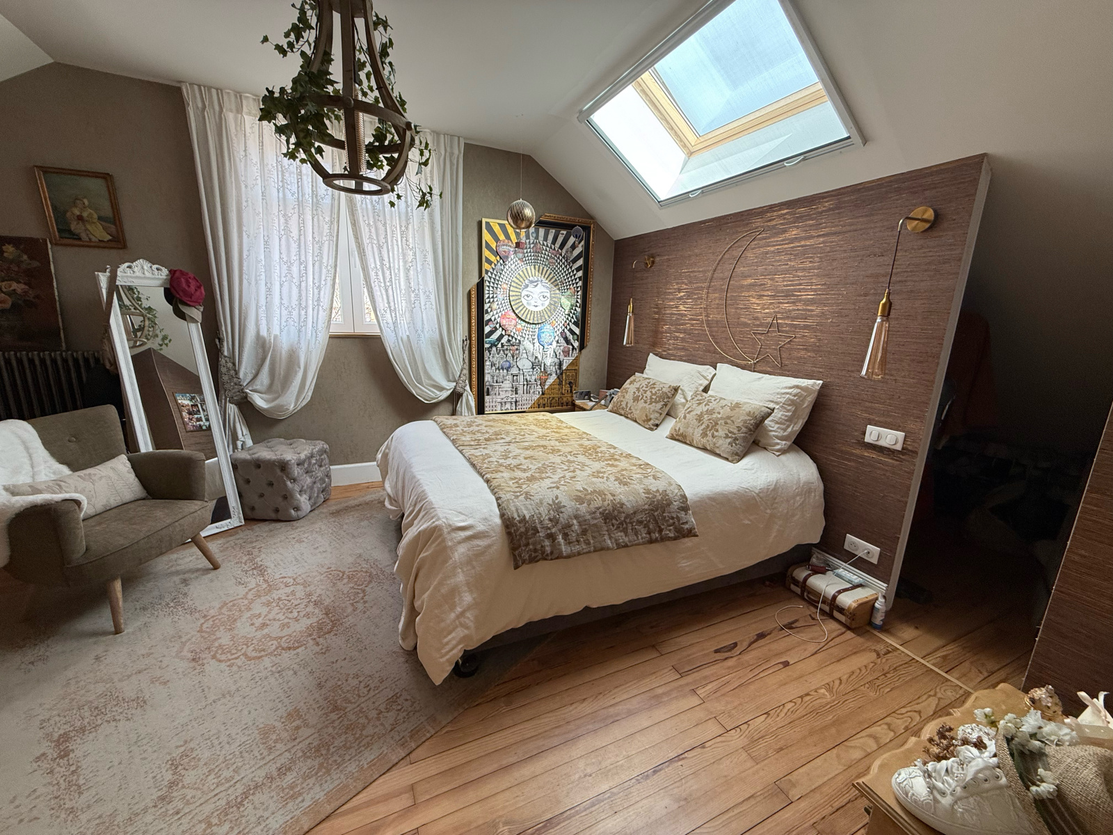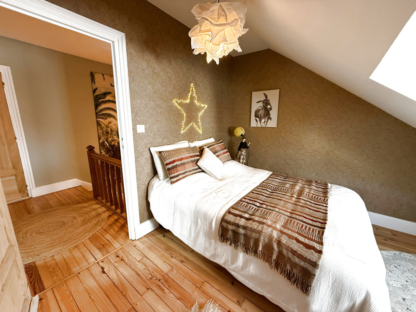 Attenant au séjour, nous avons également une pièce bureau, ou chambre potentielle, ou également la possiblité d'agrandir la pièce de vie. Un bel escalier en bois brut, (ainsi que tous les parquets), nous mène à l'étage, où nous trouvons une chambre parentale avec dressing, une salle d'eau avec wc, et une deuxième chambre mansardée.